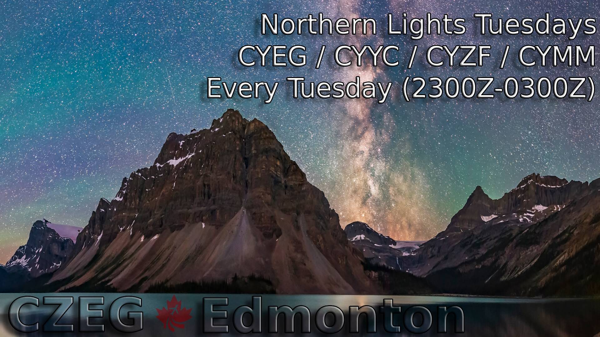 Welcome to Northern Lights Tuesdays!! every Tuesday. Fly between Edmonton (CYEG), Ft. McMurray (CYMM) or Yellowknife (CYZF). VFR and IFR are encouraged. Full ATC for airfields in the Edmonton FIR from 1700 - 2100 MT. Help us train our student controllers and enjoy full and professional ATC Services.